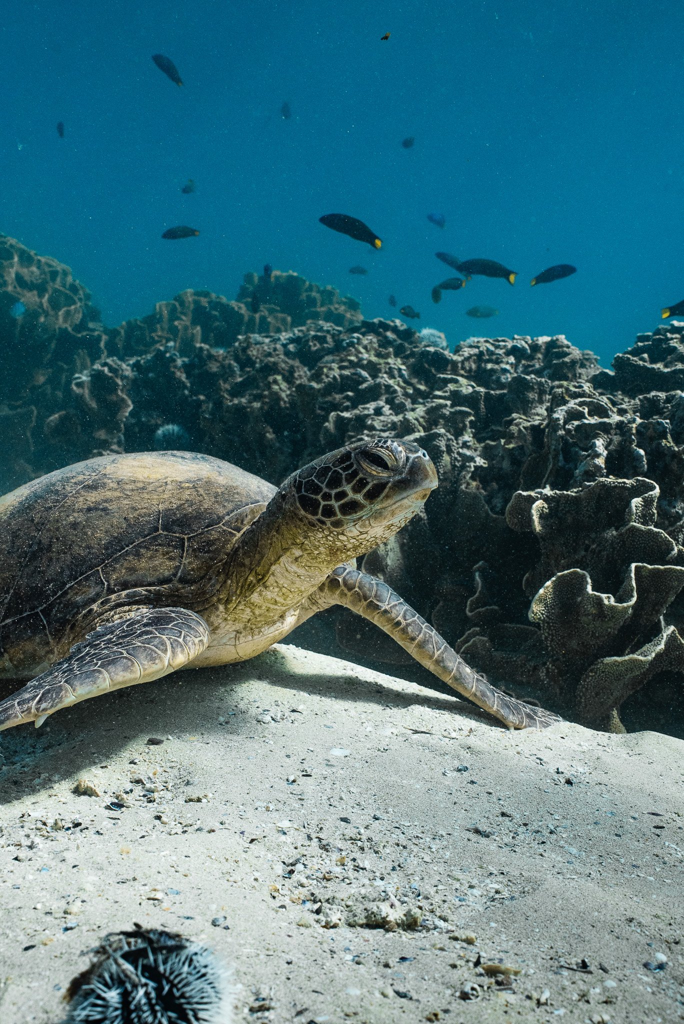 As we travel between locations, we maintain a constant lookout for marine life including dolphins, dugongs, turtles, rays, sharks and (seasonally) whales.